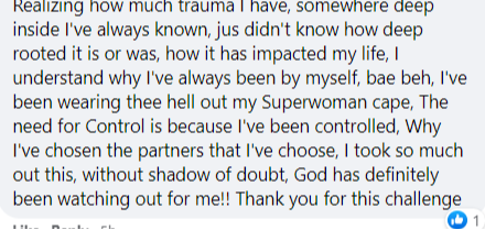 Validation: You'll feel seen, heard, and understood because you'll learn that your experiences and emotions are real and important. Self-affirmation is a huge part of healing – knowing you're not alone and that you're innocent because your trauma is not your fault.